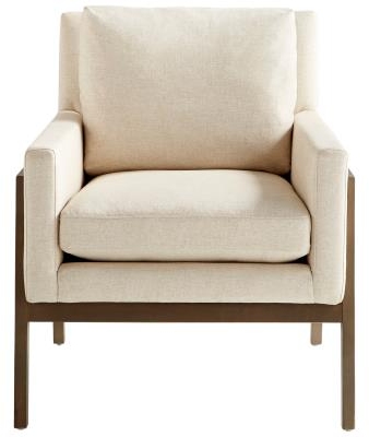 Complete the look of your living room or den whilst adding a new level of comfort, with the Presidio accent chair. Perfectly at home in contemporary or transitional aesthetics, the frame of this piece is crafted from solid wood in a natural mocha finish, and upholstered in a solid cream hue that is filled with foam. It features a cushioned back and flared arms. To care for this piece, we recommend only spot cleaning as needed.