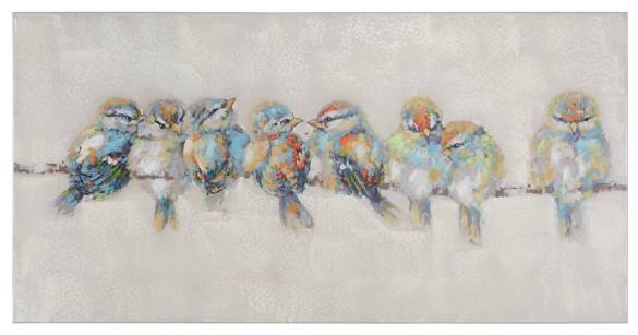There is nothing more picture-perfect than some sweet little birds all in a line. These delightful creatures will surely brighten up your living space as they sit content and tweet their song. The birds are made up of pale blues and oranges against a snowy white background. Welcome this lovely painting into your home today.Read More