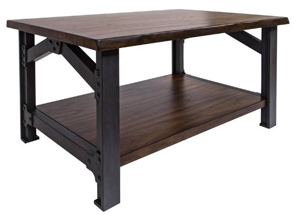 The solid wood legs are painted grey with dry brushed darker highlights and solidified with metal stud rivets. Knockdown construction is a desirable design element that offers convenience and efficiency. This coffee table will bring a rustic, industrial edge to your living room, especially with the shelves' live edges. Pair it with a comfy sofa and enjoy a casual living room or bedroom aesthetic.