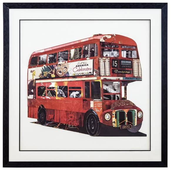 Known for tourism across the pond, this 3D collage of a double-deck bus can invoke thoughts of fun travels. The thick layers of paper used create a dimension with images of city streets.Read More